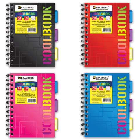 Тетрадь-блокнот 120л A5 148x210мм, Brauberg 401786 кл., гребень, обл. пласт, 3разд, CoolBook (4 вида)