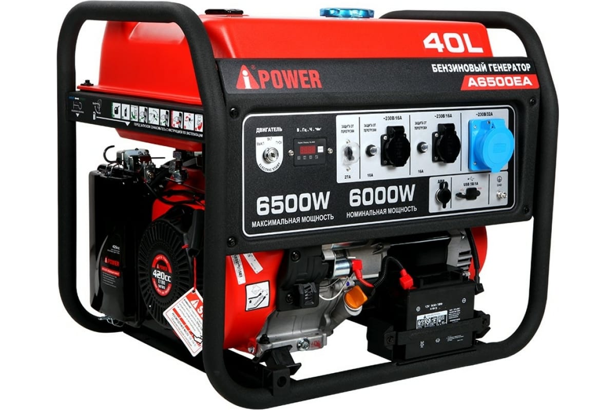 Генератор A-iPower 20109 A6500EA бензиновый (6.5/6кВт, 230В/50Гц, электростартер, разъем ATS, бак 40л, 90кг, розетки 2х220В/16А, 220В/32А, разъем USB)