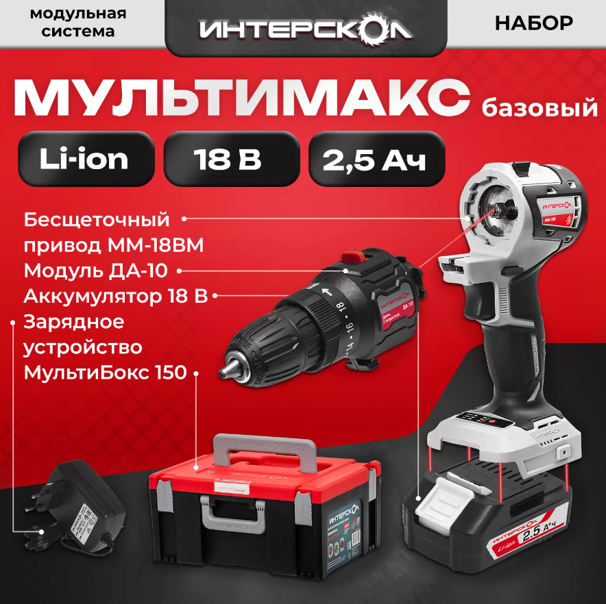 Набор электроинструментов Интерскол 755.2.1.45 Базовый МультиБОКС 150, ММ-18В, ДА-10, АКБ 1x2.5Ач, Зарядное устройство-1.5/18