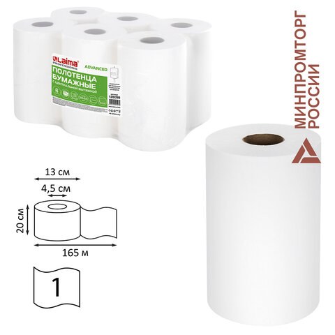 Полотенца бумажные Лайма 126098 M1/M2 Advanced с центральной вытяжкой 165 м, 1-слойные, белые, комплект 6 рулонов