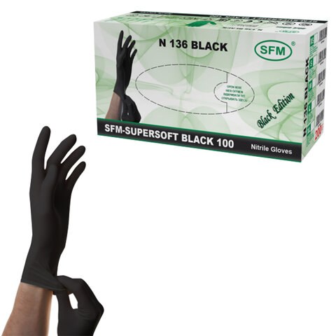 Перчатки смотровые нитриловые SFM Supersoft N136, 100 пар 200шт, размер M средний, черные