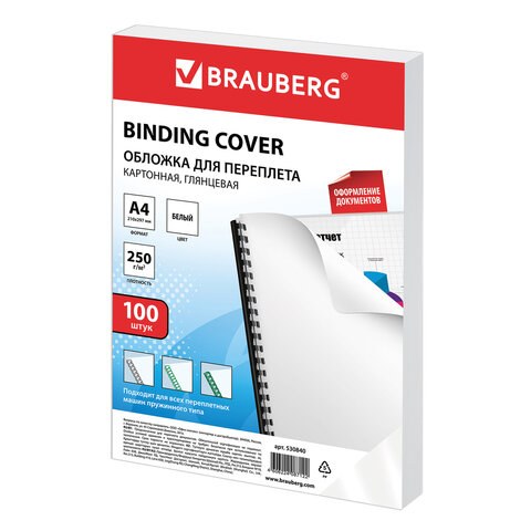 Обложки картонные Brauberg 530840 для переплета, А4, комплект 100 шт, глянцевые, 250 г/м2, белые