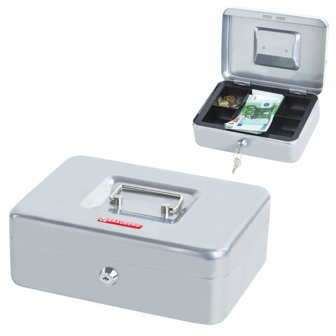 Ящик для денег, ценностей, документов, печатей, 90х180х250мм, ключевой замок, серебристый, Brauberg 291059