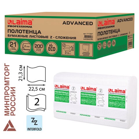 Полотенца бумажные Лайма 111337 H2 AdvanceD, 2-слойные, белые, 200шт комплект 21 пачка, 22.5х21.3, Z-сложение