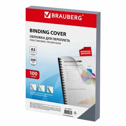 Обложки пластиковые для переплета А3 Brauberg 530936, комплект 100 шт, 200 мкм, прозрачные