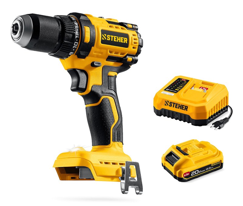 Дрель-шуруповерт аккумуляторная Steher CB-65-21 20 В, 65 Н·м, 1 АКБ LMS 2 А·ч, бесщеточная