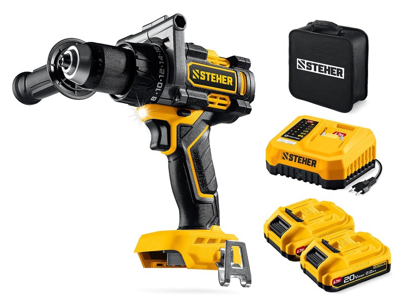 Дрель-шуруповерт аккумуляторная Steher CB-165-22 20 В, 165 Н·м, 2 АКБ LMS 2 А·ч, бесщеточная, сумка