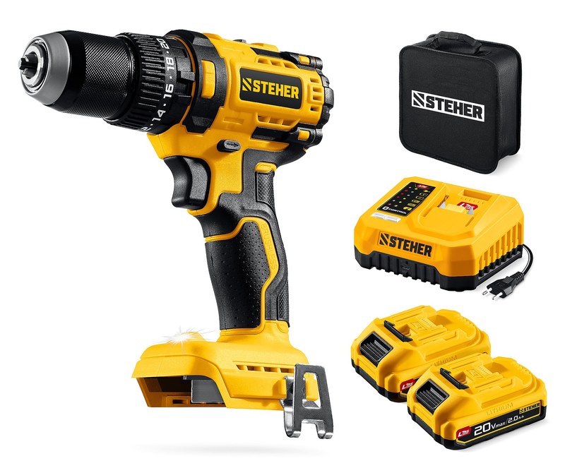 Дрель-шуруповерт аккумуляторная Steher CBS-65-22 20 В, 65 Н·м, 2 АКБ LMS 2 А·ч, бесщеточная ударная, сумка