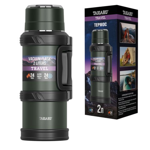 Термос 2 л TAIGARU 700316 TRAVEL, нержавеющая сталь SUS304, 2 кружки, скрытая ручка, ситечко, темно-зеленый