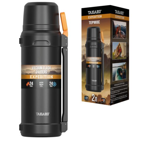 Термос 2 л TAIGARU 700317 EXPEdition, нержавеющая сталь SUS304, 2 кружки, 2 ручки, ситечко, черный
