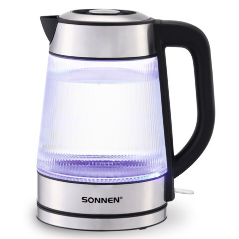 Чайник Sonnen 455143 KT-6801, 1.8 л, 2200 Вт, термостойкое стекло текстура полоска, внутренняя подсветка синяя, нержавеющая сталь